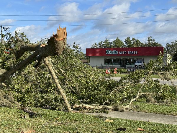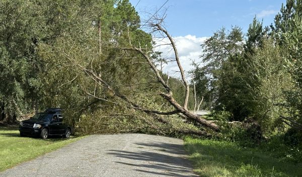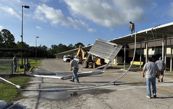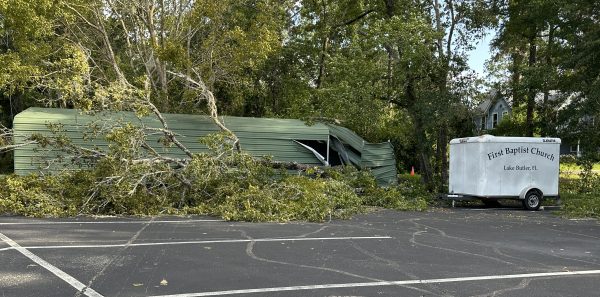 Wind damage was visible the day following the storm at the Lake Butler Hospital’s sign, Lake Butler Elementary School, and the city’s First Baptist Church.