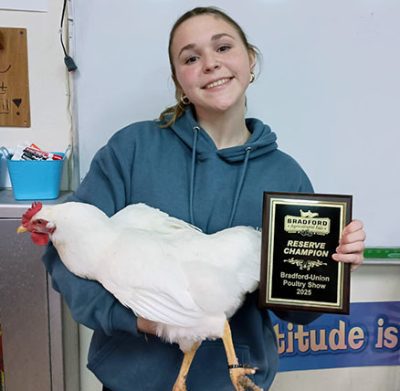 Bradford FFA received the reserve grand championship for a White Plymouth Rock pullet, which was shown by Ireland Box. Box also exhibited a Rock and a Showgirl Silkie, earning an additional two blue ribbons for FFA.
