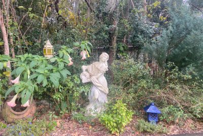 After Troy showed us several “before” pictures, it was obvious that they had great reason to be proud. Oh, what an incredible job they did! There are Crotons, Crepe Myrtles, numerous grasses, a Japanese Maple, Bottle Brush plants, Angel Trumpets, Cannas, Jasmine, Azaleas, and more. There are various sculptures or statuaries around the yard, one being a water fountain that is the watering hole for all the local cats. Their little Shih Tzu, Tiki, is not always so welcoming, but he tolerates them.