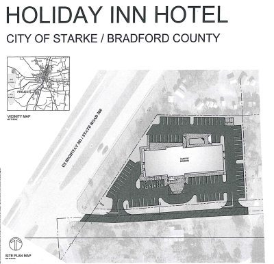 The Holiday Inn has been expected since July 2018 when the Bradford County Commission, sitting as the Board of Adjustment, granted a variance to allow the hotel to exceed the 39-foot height restriction and build up to four stories.