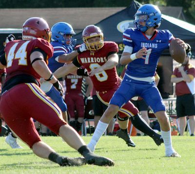 Keystone’s first offensive series began with West Nassau’s Levi Bowler sacking Ryder Trull for a 7-yard loss. A fumbled handoff on the next play resulted in a loss of 5 yards. The Warriors did give Keystone’s offense new life, with roughing-the-passer and unsportsmanlike-conduct penalties giving the Indians a first down at their own 45, but the first play from there was a bad shotgun snap that resulted in a loss of 16 yards. After a 1-yard run by Kyle Perkins and an incomplete pass, Keystone punted.