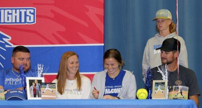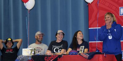 Keystone Heights High School senior softball players Madi Mitzel and Emma Rogel work together on the field as pitcher and catcher respectively, so it seemed fitting that the two participated in a joint scholarship-signing ceremony on Feb. 28 in the school’s cafeteria.
