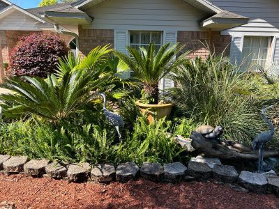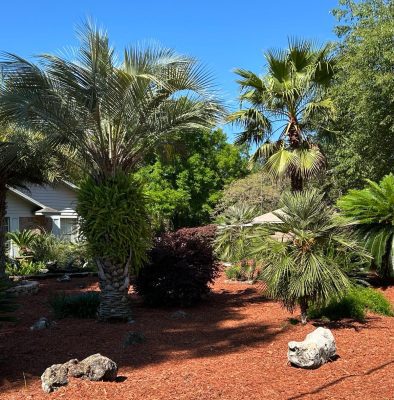 The ground is covered by mulch, which obviously does not need water, and all the plants are drought tolerant. Ed planted Sago Palms, Sylvester Palms, Pindo Palms, Washingtonia Palms, commonly known as the Mexican Fan Palm, and Loropetalum, also known as Chinese Witch Hazel. Large rocks that Ed got from numerous places are placed around to break up the landscape and add an interesting touch.