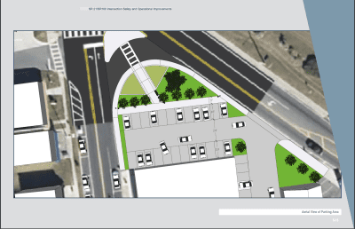A key part of the plan is for the city to acquire a triangle-shaped parcel on the southeast corner and demolish the former Kentucky Fried Chicken and Chinese Restaurant that now sits on the land. A consultant recommended that the city convert the parcel into additional parking and an open area with trees and grass. Image: AktinsRealis