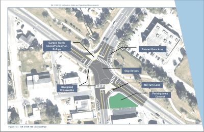 Proposed improvements to the State Road 100 and 21 intersection include realigned crosswalks, skip lines through the center of the intersection to guide motorists making left turns, and a painted gore area near Walgreens to guide cars through an unusually spacious area for vehicles turning right from westbound 100 to northbound 21. The proposal also includes signal enhancements and the construction of two pedestrian islands on the northwest and southeast corners of the junction. Image: AktinsRealis