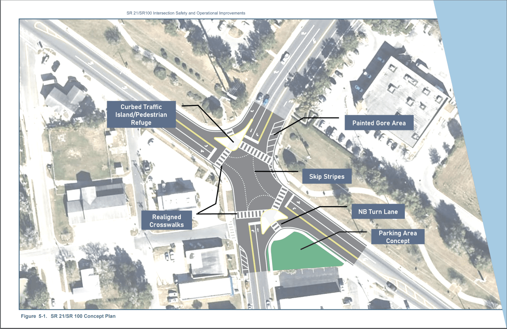 The plan also includes eliminating street parking near Keystone Gun and Gifts and creating a right-turning lane on northbound State Road 21 for cars turning onto eastbound SR 100.