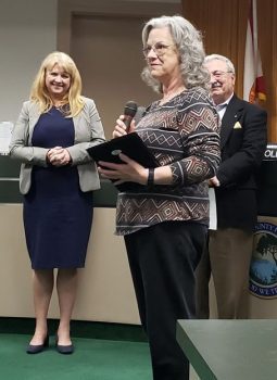 Retiring Keystone Heights librarian Margaret Whipple said her job at the Keystone Heights Library was rewarding beyond her paycheck. “I’ve gotten back much more than I’ve ever given,” she said. Also pictured are Commissioners Betsy Condon and Wayne Bolla. Photo: Clay County Government.