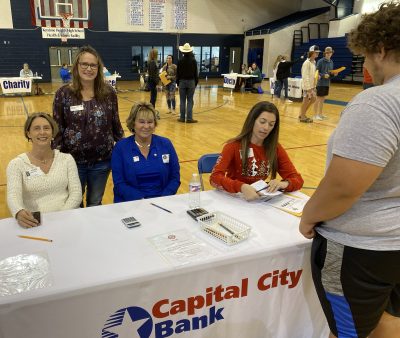 Rachel Sessions (right) of Capital City Bank issues a check register and instrctions to a student. Also pictured from the bank are (l-r) Patricia Evans, Ginger Lee and Penny Pearson.