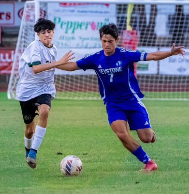Noah Jaramillo (right) attempts to beat an Eastside player to the ball. Photo by Amber V. Foley/APEX Photography.