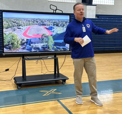 School and district leaders emphasized the benefits of athletics during a ribbon cutting for Keystone Heights Junior-Senior High School’s new track on Friday, March 22. Because of rain, the ceremony was moved to the school’s gymnasium.