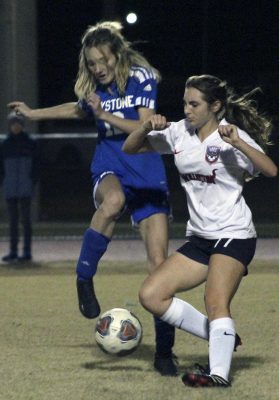 Ella Hutchins (left) scored four goals in the Indians’ 11-0 District 4-3A quarterfinal win over Interlachen. File photo by Cliff Smelley.