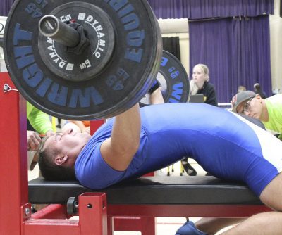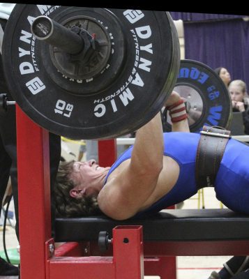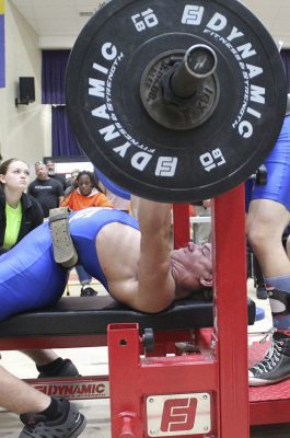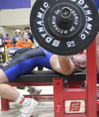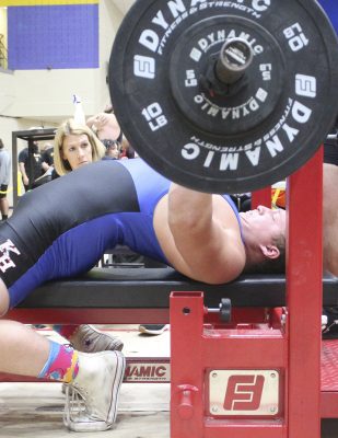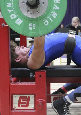 Reid Begue competes in the bench press. Photo by Cliff Smelley.