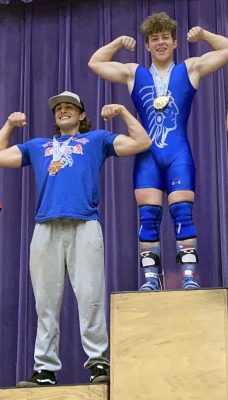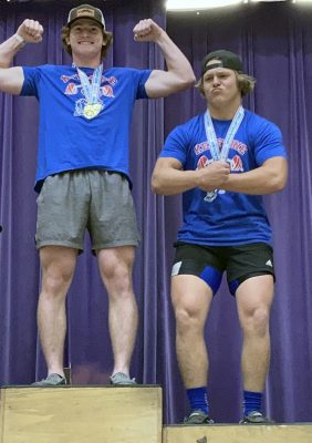 Bryar Schenck (left) and Tyler Jenkins show off on the medal stand after placing first and second, respectively, in the 183-pound class in the snatch event. Photo by Cliff Smelley.