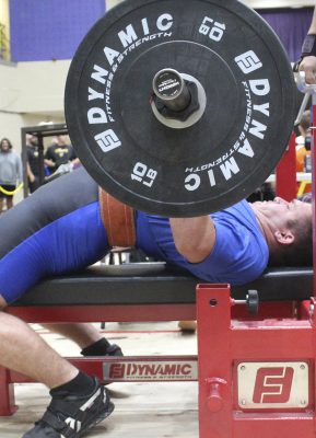Nathan Tisdale competes in the bench press. Photo by Cliff Smelley.