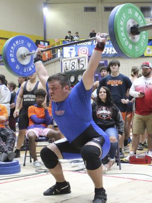 Trey Jeffries competes in the clean and jerk. Photo by Cliff Smelley.