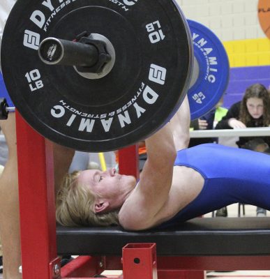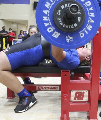 Wyatt Van Zant, with teammate Reid Begue spotting, competes in the bench press. Photo by Cliff Smelley.