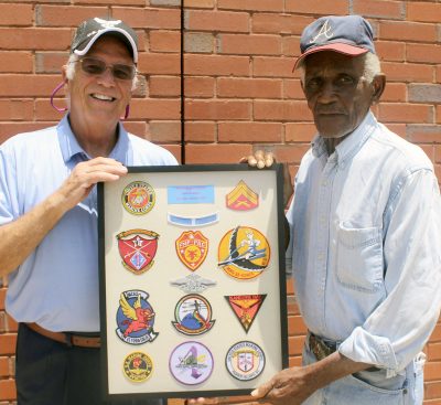 Amos DeSue (right), a Korean War veteran, is presented with a framed display of his Marine unit patches by Bruce Williams. Photo by Cliff Smelley.