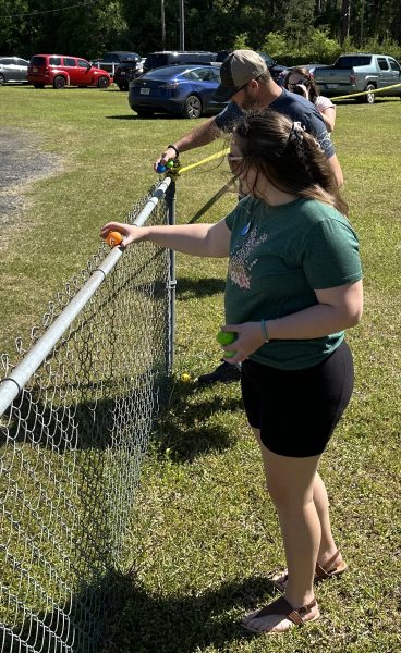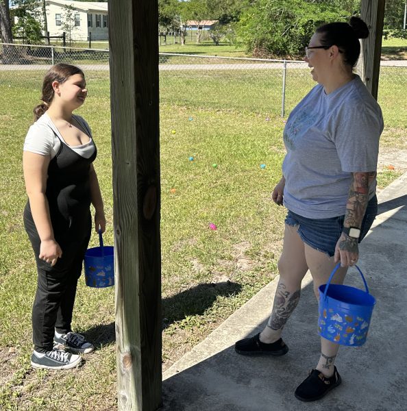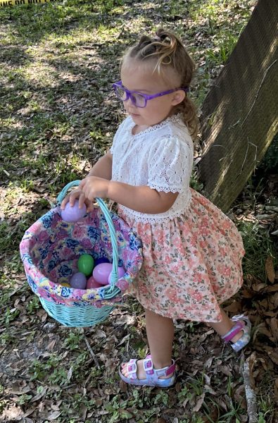 Waiting for the Easter egg hunt to begin are Megan Harlow and her children, Melody, a third grader at Lake Butler Elementary School, and three-year-old Dawson. Megan, a stay-at-home Mom, said she had been coming to the event for a couple of years. Melody said she enjoys the Easter egg hunt. However, her favorite VFW event is the Halloween trunk-or-treat in October.“You got my hiding spot, Mom.” Lake Butler Middle School student Madelyn Hardin disputes with her mother Joy over who had the rights to a hiding spot in the teenage section of the egg hunt.Aaron Frank and Emily Kirby hide eggs in the elementary-age section of the egg hunt. Neither are VFW or auxiliary members, but volunteer to support family members who are. Frank is a paramedic and small business owner. He said he is saddened by the declining membership of veterans’ organizations and attendance at events like the VFW Easter Egg Hunt. “It would be nice if we could fill up this parking lot for Easter and Halloween,” he said.As Charli Foerman, 3, drops one egg in her basket, and immediately turns to look for another in the preschool section of the hunt.