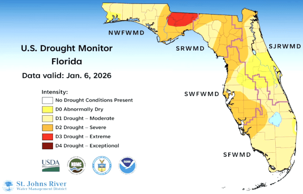 The bureau chief for the St. Johns River Water Management District said below-average rainfall in December pushed the western and northern sections of the district into severe drought conditions, with other areas of the 18-county district undergoing moderate drought conditions.
