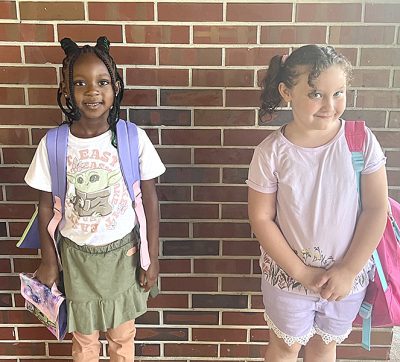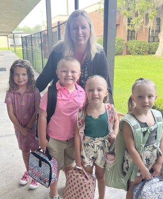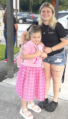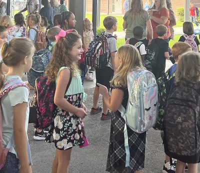 First day of school excitement and jitters as mom Shiann Bradley hugs daughter Kynslee Wilson goodbye at the drop off.First day of first grade for these friends. All smiles as they await their walk to their new classroom.Lawtey School fourth-graders Lillycate and Makenna enjoying the early morning downtime before the new school year kicks off.Lawtey Elementary School Principal Terri O’Quinn welcomes the some of the new kindergarten class to their first day of school.It was a family affair when three generations were together on the first day of school John (left), son Baylor (center) and grandmother, School Board Member Gayle Nicula (right).It’s fun to see your friends after summer vacation! First day back is always a frenzy of chatter and anticipation.Law