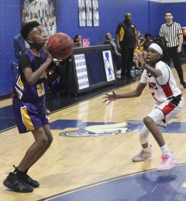 A.J. Chandler (left) sets up for a three-point shot. Photo by Cliff Smelley.