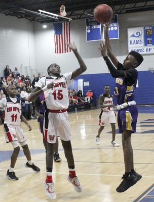 Anthony Wiseman (second from right) attacks the rim. Cole Fillyaw (far left) is also pictured. Photo by Cliff Smelley.