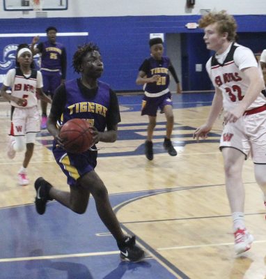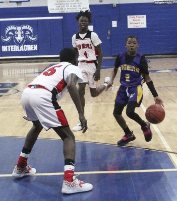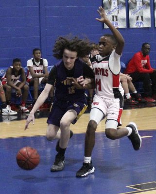 Cole Fillyaw (left) dribbles into the paint. Photo by Cliff Smelley.