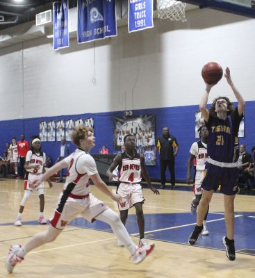 Garrison Smith puts up a shot along the baseline. Trent Nash is also pictured. Photo by Cliff Smelley.