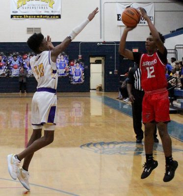 Bradford’s Caiden Carn (right) attempts a three-point shot over Lake Butler’s A.J. Chandler. Photo by Cliff Smelley.