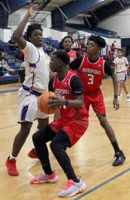 Lake Butler’s Tyrese Chandler (far left) prepares to contest a shot by Bradford’s Kaedan Parks. Photo by Cliff Smelley.