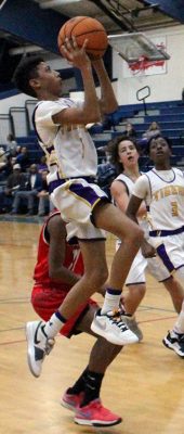 Lake Butler’s Tyrese Chandler (third from right) goes up for a shot in the lane. Photo by Cliff Smelley.