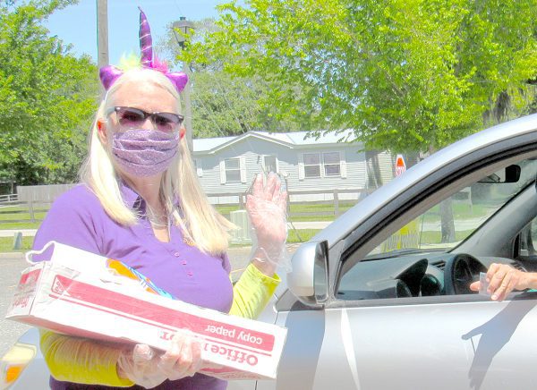 Mary Brown, dressed as a unicorn, assists a library patron during the library’s drive through check-out program durinng COVID.