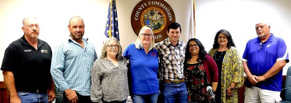 Library Director Mary Brown informed the members of the Union County Board of County Commissioners that the meeting seen here (May 20, 2024) would be her last. Her retirment date is set for July 1). Pictured are (l-r) Jimmy Tallman, Willie Croft, Diane Hannon, Mary Brown, Channing Dobbs, Pretti McNutt, Donna Jackson and Mac Johns.