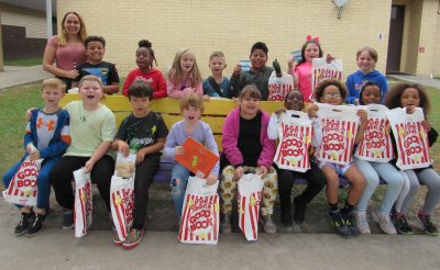 A second-grade class fills up their book bags.