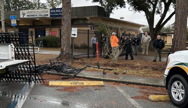A man crashed a Nissan pickup into the front fence of North Florida Technical College Monday afternoon.