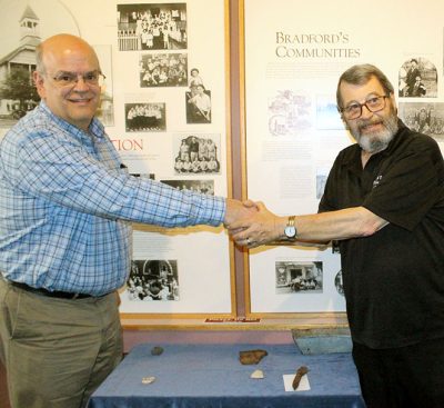 Golding presented items that were found on a tract southeast of Starke. One was a piece of salt-glazed pottery believed to date back to the latter half of the 19th century, while two items were pieces of Native American pottery believed to be 500-1,000 years old.