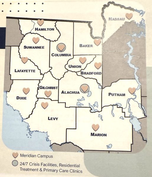 Meridian Healthcare maintains offices in 14 counties with 24-hour acute care facilities in Gainesville and Lake City.