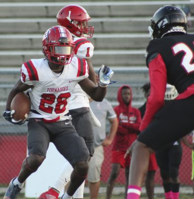 Bradford’s Manny Covey returned the ensuing kickoff for a touchdown, but a penalty for an illegal block nullified the score and had the Tornadoes starting a drive at their own 37. A 9-yard reception by Hankerson and an 11-yard run by Jones resulted in a first down. A 13-yard reception by Pollard gave Bradford a first down at the Baldwin 25. Pollard caught two more passes to move Bradford to the 10. Jones, who rushed for 68 yards on 11 carries, scored on a run from there with three seconds left until halftime. Hughes kicked the extra point as the Tornadoes went into the break trailing 24-14.