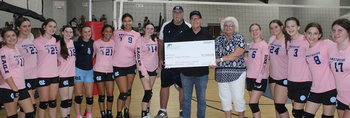 Ed Belyew, pictured with the Northside Christian Academy volleyball team, receives a $1,000 donation at NCA’s annual Dig Pink volleyball tournament. Pictured (l-r) are Caylee Young, Gabby Smith, Callie Potts, Ali LaFollette, Addison Wilson, Briley Gay, Brooklyn Cooper, Baeliegh Bradley, Coach/Athletic Director Todd von Weyhe, Ed and Toya Belyew, Maddie Garrison, Bella Smith, Caydance Slayton, Stella Vahlakis and Kaylea King.