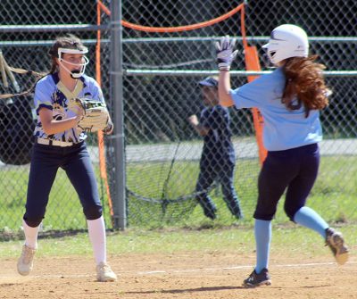 Third baseman Ava Welsh (left) prepares to put out an Open Bible runner.