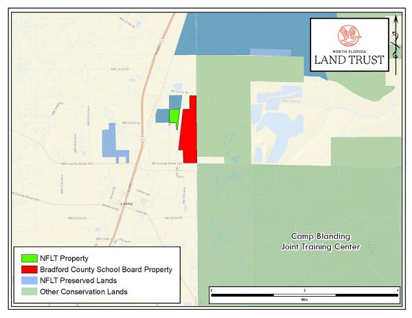 Matthew Corby, environmental manager for Camp Blanding said, “The Department of Military Affairs is excited to partner with NFLT and BCSB to support future development of educational opportunities within Bradford County while also continuing to secure Camp Blanding Joint Training Center’s readiness and training capability.”