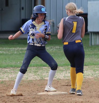 Hope second baseman Allyssa Wilson (left) waits on a throw as Northside’s Aliyah Crocker makes her way to second.