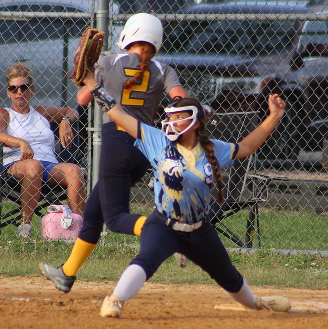 Ava Welsh (left) reaches second safely for Northside. Hope second baseman Allyssa Wilson is also pictured.