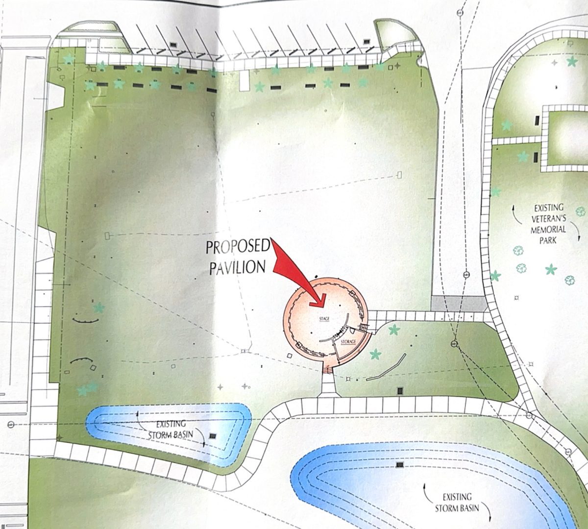 Mayor Andy Redding mentioned adding a small stage to the storage area behind the pavilion since it will face the new Veterans Memorial Park and could possibly be used to set up a podium during ceremonies.