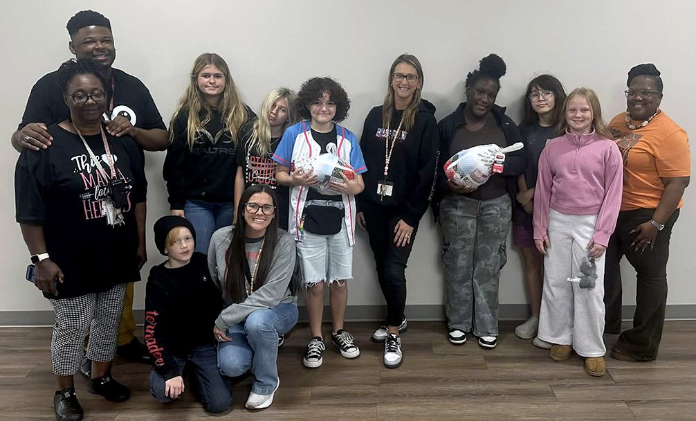 Bradford Elementary School’s student council invited community sponsors to support families with a Thanksgiving turkey drive, which resulted in 35 turkeys being given out. Special thanks go to turkey donors Julie Johnson, Janice Mortimer, Candace Osteen, Scott Roberts and Gordon Smith. Pictured are: (front, l-r) Elijah Douglas, Student Council Co-Sponsor Vanessa Sweeney, (back, l-r) Tonjala Tyson, Student Council Sponsor Jaquan Bryant, Addison Jackson, Anslee Weis, Harper Harrell, Principal Cassie Melvin, Chloe Cruger, Faelynn Jones, Jaycee McDaniel and Student Council Co-Sponsor Natalya Cruger.