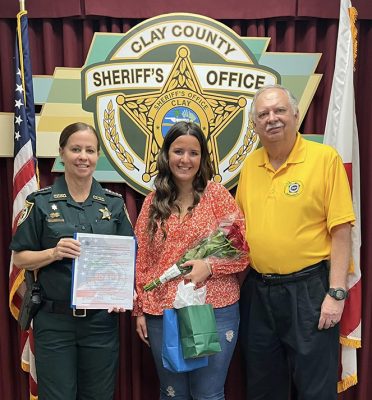 Recent Keystone Heights High School graduate Amber Cunningham became the first Clay County student to receive the Defense Acquisition Professional Alumni Association, Jacksonville Chapter, CTE Scholarship, which was presented through a partnership with the Clay County Sheriff’s Office. The scholarship is valued at $2,000. It was another first for Cunningham, who’ll attend the American Academy of Cosmetology. Prior to graduating from KHHS, she became the first recipient of the $2,500 Cliff Avril Family Foundation Trade School Bound Scholarship. Cunningham (center) is pictured with Clay County Sheriff Michelle Cook (far left) and Duane Mallicoat, the DAPAA Jacksonville Chapter president and scholarship coordinator.