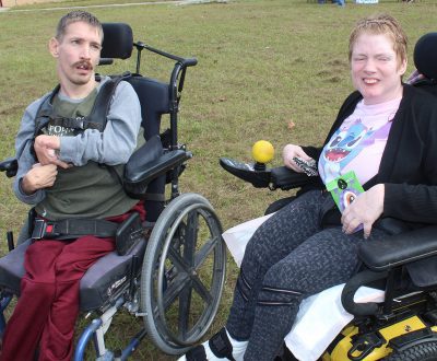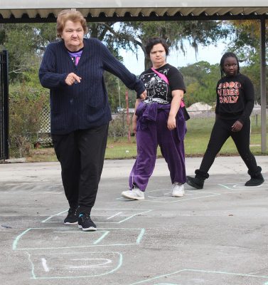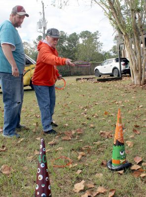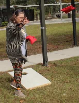 Terri Smith tosses bean bags as This year’s cow-patty bingo also featured games as part of a fall festival at the Arc’s new location at the old Hampton Elementary School. Photo by Cliff Smelley.
