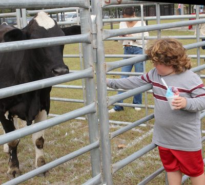 Nathan Bannon takes time from enjoying his snow cone to try to pet Bessie the cow. Photo by Cliff Smelley.