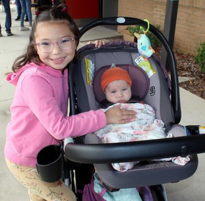 Dani Veliz (left) has fun hanging out at the cow-patty bingo and fall festival with her sister, Gabi, who is approaching the age of 3 months. Photo by Cliff Smelley.