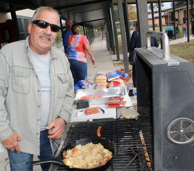 Steve Dara mans the grill at every cow-patty bingo, which offers up free hot dogs for visitors. Photo by Cliff Smelley.
